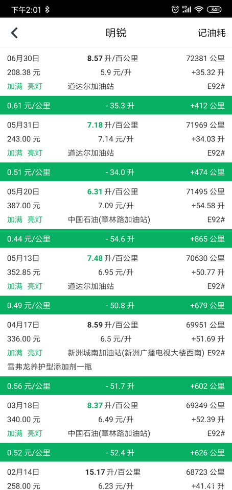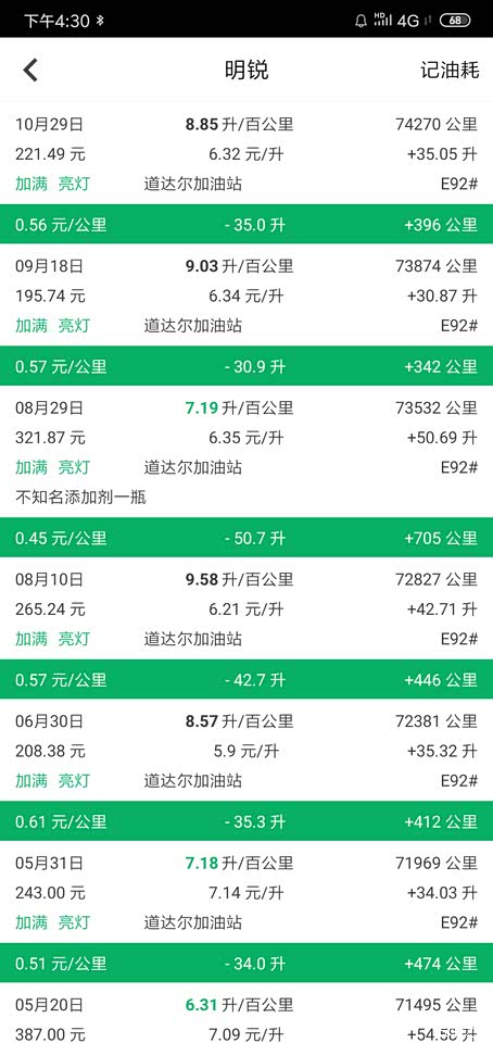 每次加油都记录了,基本都是加满记录的,总体油耗在6-9之间浮动!