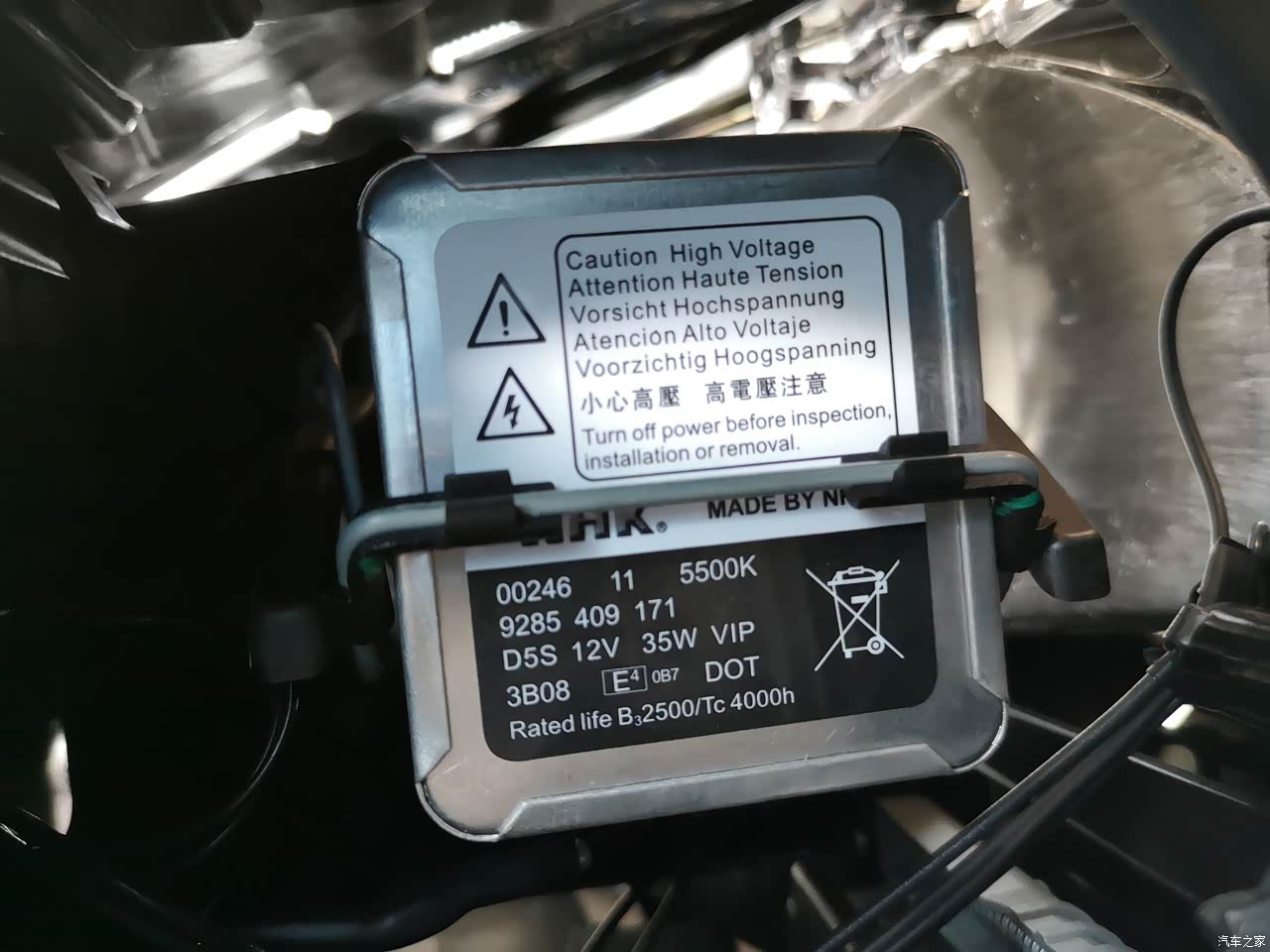 更换后的疝气大灯灯泡。