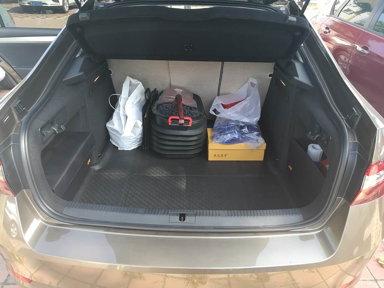 很多车友反应速派车的隔音不好,共振让人很烦躁、难受,噪音主要来自后备箱。有车友给后备箱做隔音。安奈不住的我,也开始动手,买了两平方五毫米的隔音棉,给后备箱地板做了隔音,隔音棉是自带装面交的,裁剪好自己铺。后置物板的缝隙比较大,与后排椅背之间有1.5厘米的缝隙,使得后备箱的噪音能很大的传到驾驶舱,我又给置物板加了一圈密封胶条,堵住缝隙。做完后共振问题没有了,噪音小了,声音变沉闷了。 这款车门板水杯那里居然没有绒面衬布,放水杯走烂路会当当响,这次让我把那里也粘上薄的隔音棉了,防震。迈腾车那里都有衬布。 吐槽一点,前几天我给车四轮倒换位置,发现前刹车盘生锈严重,两个前轮都有,就是轮毂与刹车盘接触的那个平面,不卸轮胎看不到,里面都生锈了,我用砂纸打磨干净后,又上了点油,希望能缓解,后轮没有这样的现象,应该是前轮刹车盘的工艺不够好。