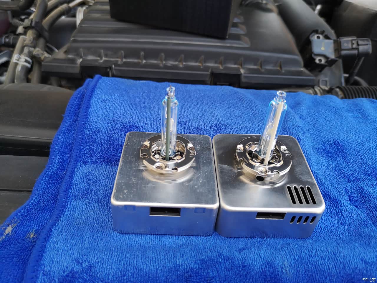 更换的35瓦疝气灯泡和原车25瓦疝气灯泡对比。