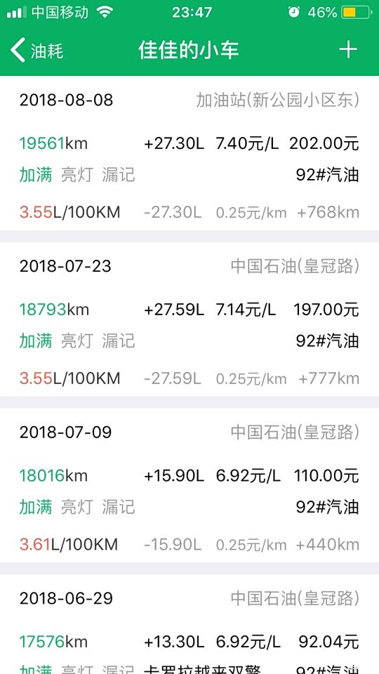 平时市区加郊区的路况跑的多一点,平均一个月加3-4次油,每次加油130元-160元不等,一个月大概跑2000公里左右,小熊油耗一直在记录,每月油费大概400元~600元不等。