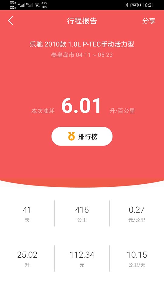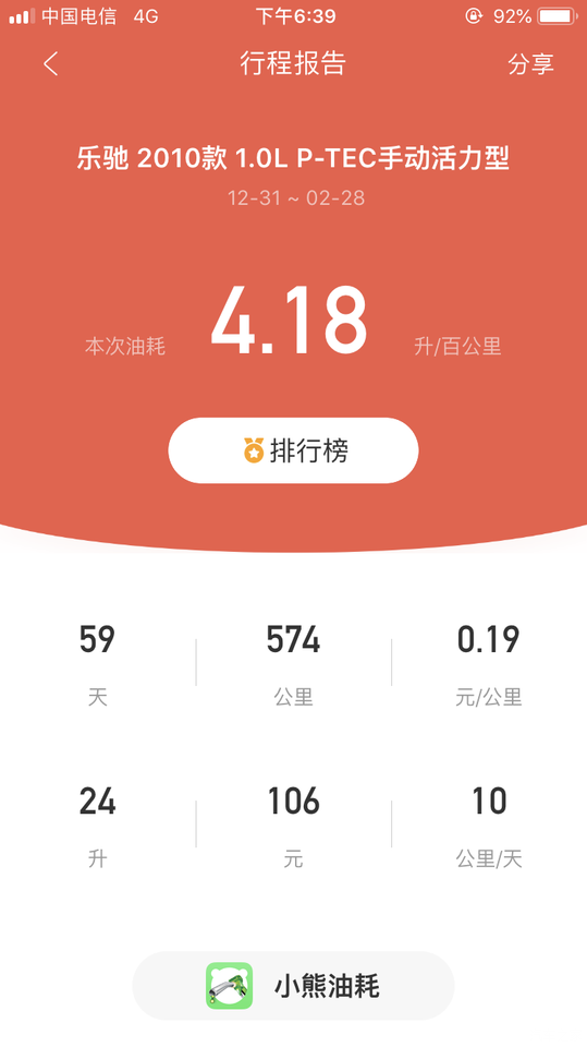 过年这一段,乐驰比上月稍微多跑了几里路,终于加了一次油,满箱油对满箱由的测下来,这一整段时间的油耗是4.86L/100km,和预想的要好不少。