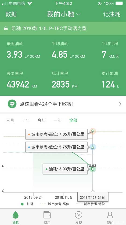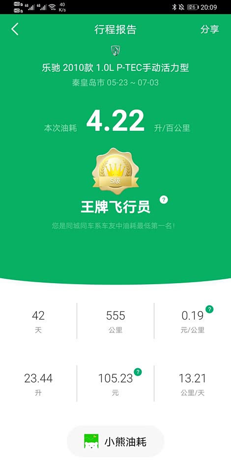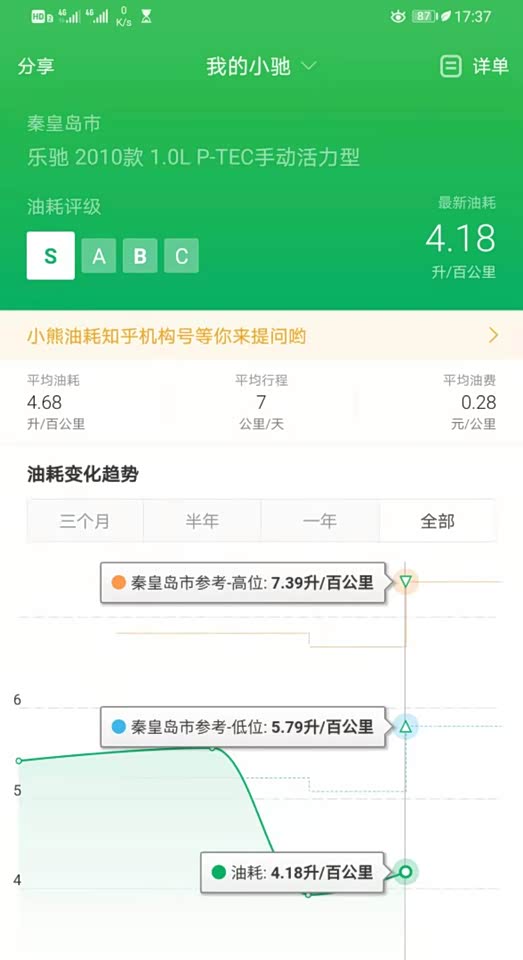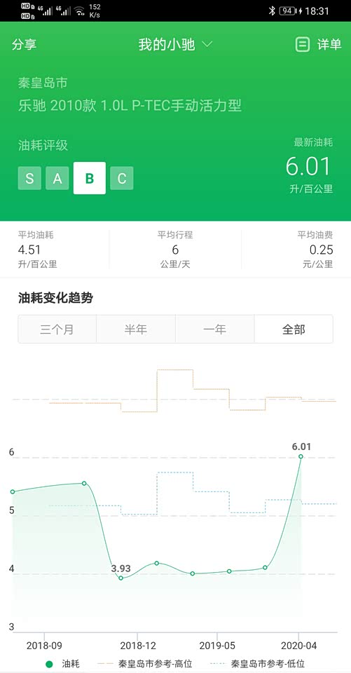 这次的油耗只能是一个估计值了,最近一年由于yq,乐驰基本上都是老妈自己加的油,没有做记录,这次是因为要去保养了,顺道给老人加满了油,而平均油耗只能是拿手进行的估算,这样数虽然没有用满箱对满箱的方式来掐准确,但是小乐驰的油耗一直比较稳定,出入不大,这个数据还是感觉比较靠谱的,但是到了冬天了,气温越来越低,油耗会增长一些。