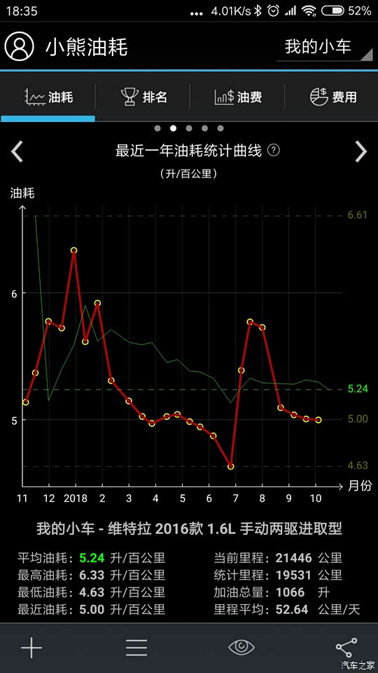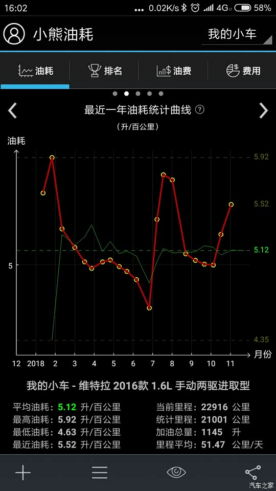 平时也就上下班(单趟26公里),偶尔回趟老家(来回一百公里多点),上班路程一半堵车一半顺畅,回家的路就是国道,总体路况良好,是油耗低的根本原因,再加上不经常暴力驾驶所以油耗较低比较满意。综合油耗小熊油耗统计5.12(总里程统计)