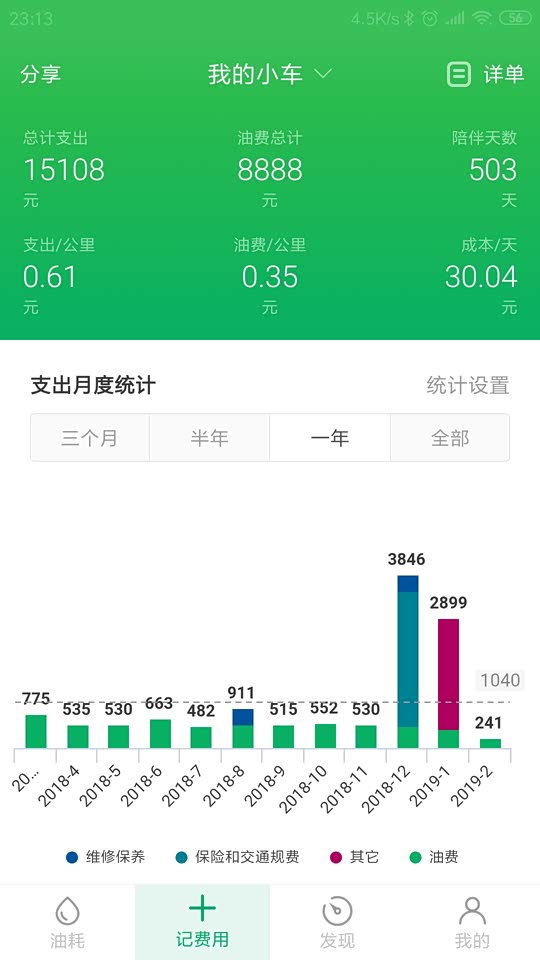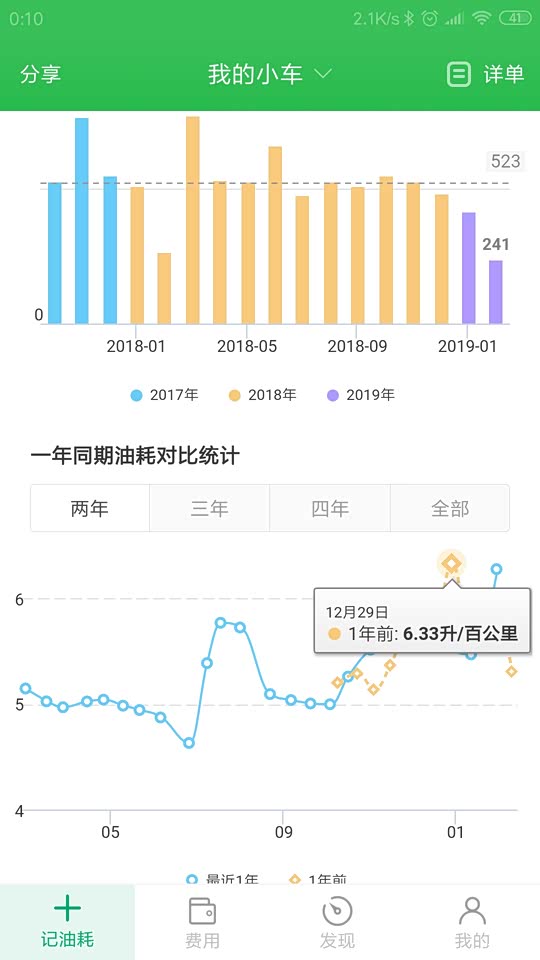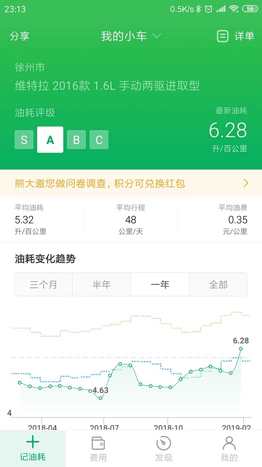 目前来看油耗对比去年在同一曲线上,去年最高油耗是6.33,今年最高油耗是6.28,冬天开暖风确实费油。