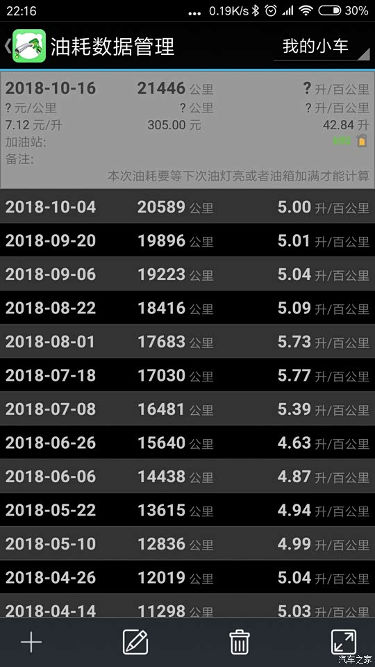 表显油耗和实际油耗有偏差,我的车计算过后有0.2的偏差,基本可以忽略。目前表显油耗4.9,平均速度36km/h,非常满意的油耗,已然超过部分轿车油耗,目前这油价上涨的态势对吧,估计年底上7是木有问题的,开小维安逸啊。