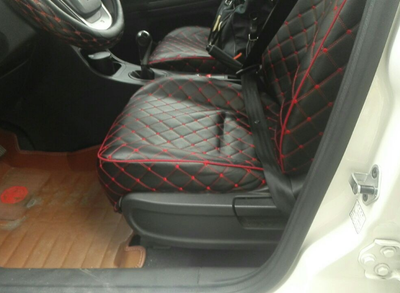 里面的座椅内饰是织物包裹的,摸着感觉挺好。内饰本身的颜色主调是黑色,作为一个女生还是不太适合的,我这人比较外向,喜欢生动一点的,黑色看着有点沉闷,所以我自己买了一套座椅套和脚垫,像图片那样,红色的线条搭配黑色,看着还挺有档次感的。喜欢前面中控台部分比如空调处出风口都抛弃了经典的棱线设计,用曲线代替,看上去不觉得方正死板,多了活泼灵动的感觉,很符合我的审美。