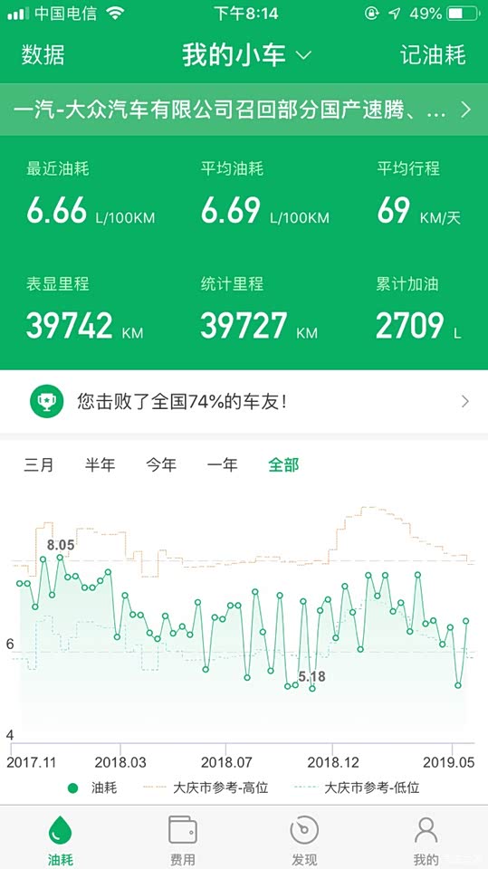 油耗是我最满意的地方,目前已行驶18000公里,新车接回来开始一直小熊油耗作记录,没有漏记过一次,现在的平均油耗是6.97。1.4T最经济的时速是每小时70公里,所以跑高速的时候其实并不省油.定速每小时120开空调差不多不到七个油。定速100的话五个多点。我最低一次市区加城市快速路开过4.8。有点不敢相信。一箱油跑到红线两头基本上都过七百公里。最高跑过八百公里,指针到底,续航显示0。不过加油到跳枪只加了不到52升,再跑个三五十公里应该没事。