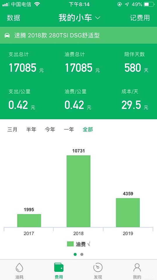油耗一直不高,夏天五六个油,冬天七八个油,平均下来6.6。我买车第一次加油开始就一直用小熊油耗做统计,从来没有丢下过一次。第一张图是累积四万公里的油耗,第二张是总的费用。仪表油耗表现与实际油耗变现出入不大,可以作为参考。五千公里过后一直加92号汽油,没有特殊情况基本选择固定中国石化加油站。