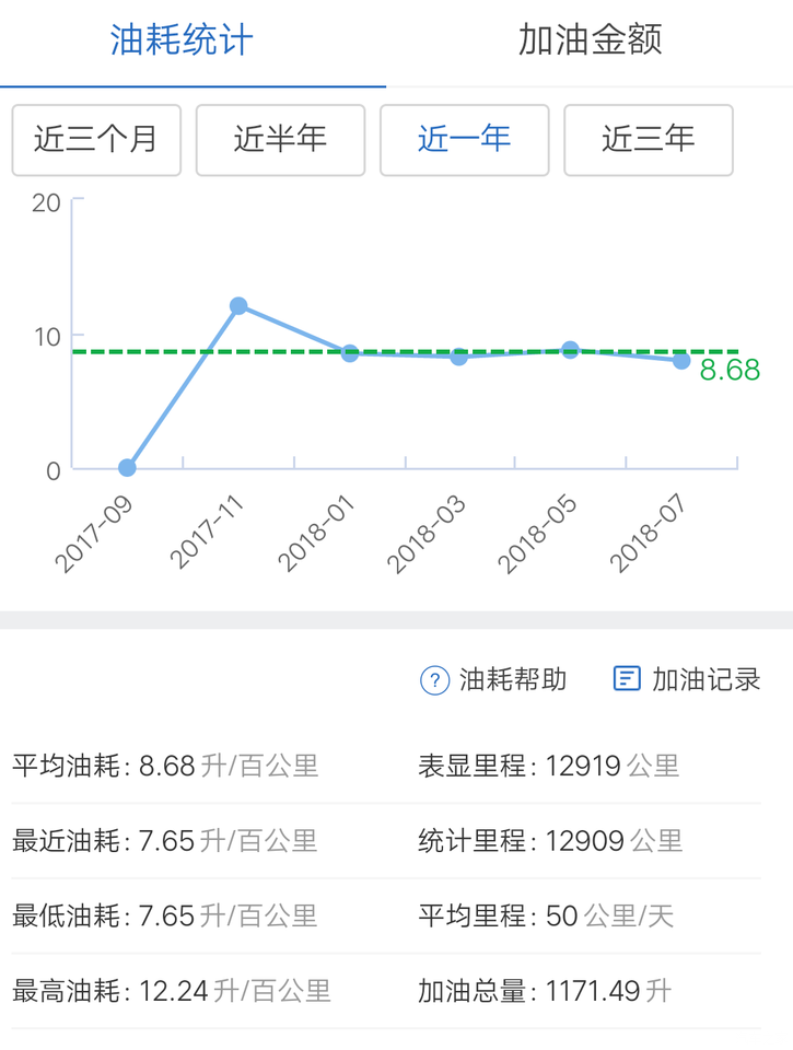 这是汽车之家上记录的油耗,每次都加满,表显是8个油,实际计算的要比表显多1个油