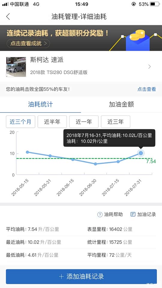 日常就是郑州市区,跑的比较多,拥堵也多,基本一天90多公里,13或14个油。一月一次到武汉的长途,来回1000多公里高速,高速定速巡航后5.4个油。