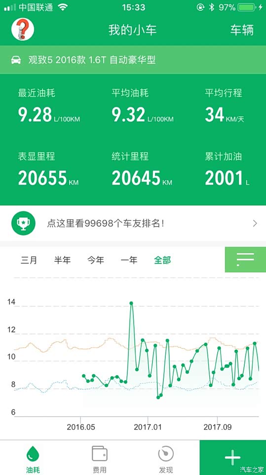 至于油耗,其实这和各人的驾驶习惯和驾驶路况有些直接的关系,像我纯市区因为短途的原因,我能开出14.7的最高油耗,但是我上了高速也能开出最低6.1的油耗,所以平均来说,市区10-12是常见的,高速7-9也是常见的!目前来说我的综合油耗9.3,以小熊油耗为准,毕竟这软件比较准确,当然汽车的车机也准确和小熊油耗差不多,而逸云的油耗就显得不那么准了,总是高过一头!不知啥道理!