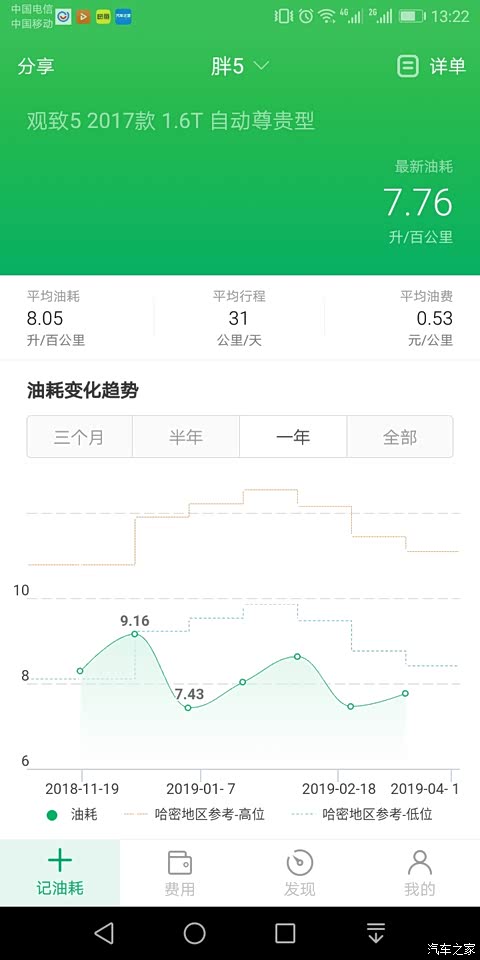 上周换成四季胎,这是最近一次的小熊油耗7.76