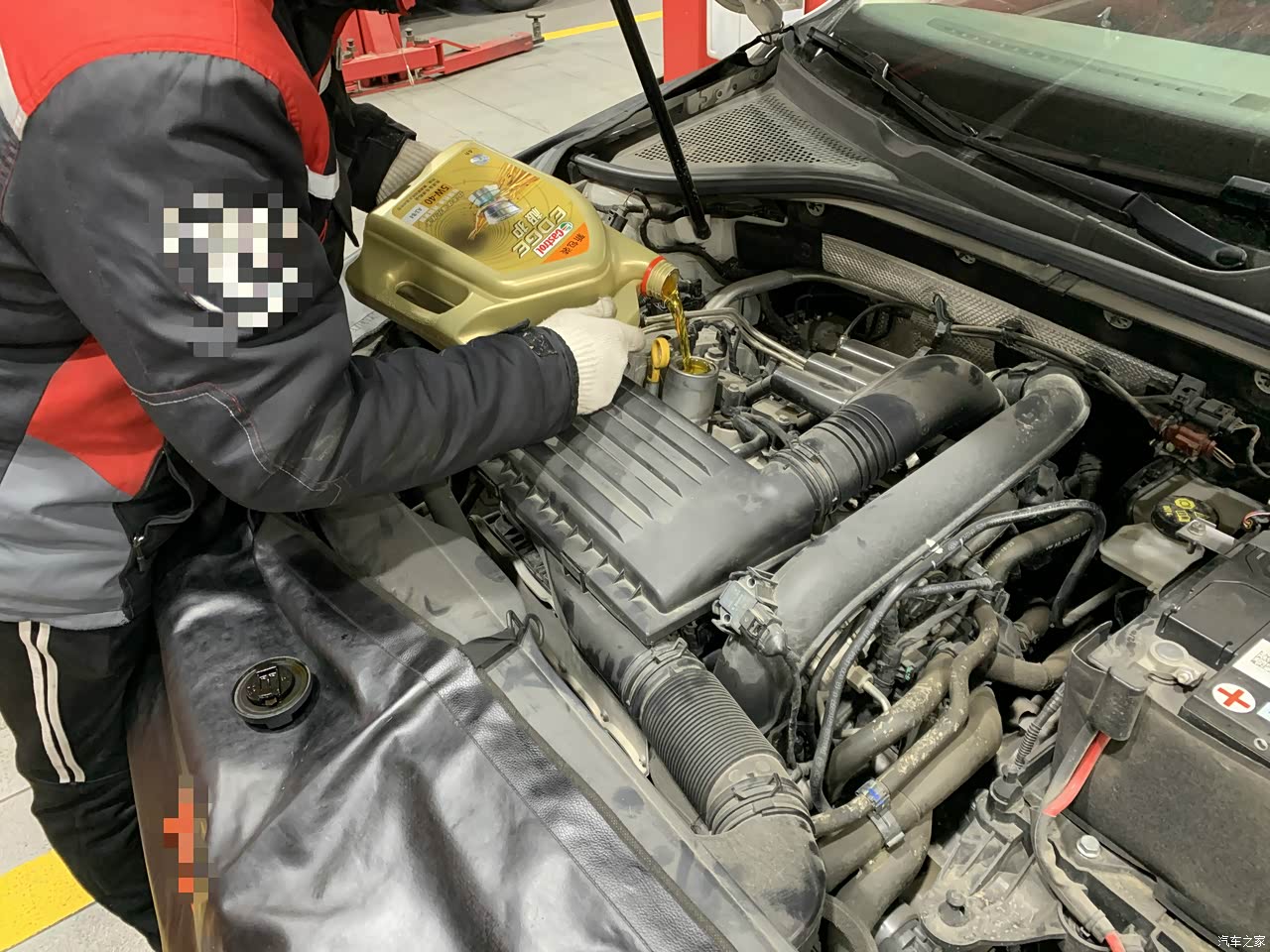 师傅正在加注嘉实多极护5W-40全合成机油,大概加了3.8L,留了一点点