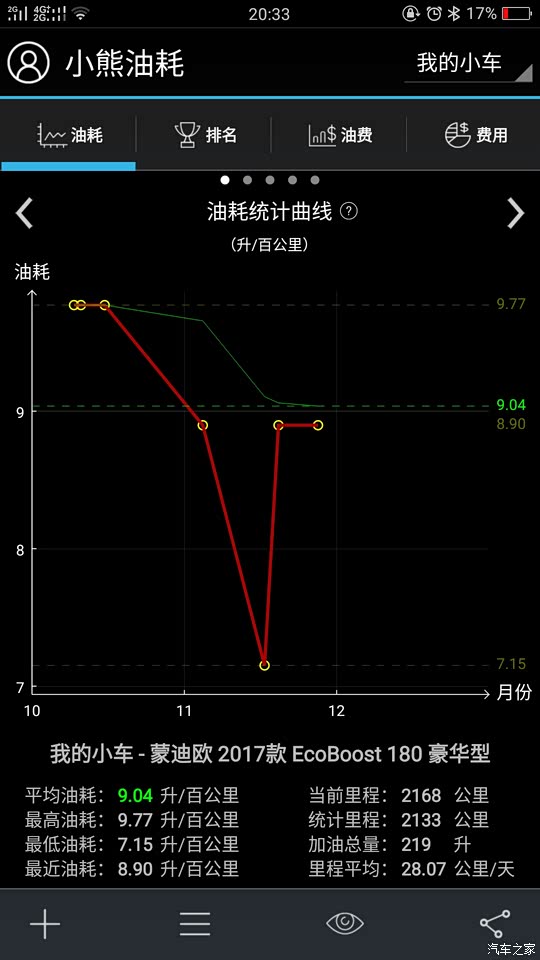 目前行驶了2720,下图油耗是2168公里前的,感觉表显油耗不准,我用小熊油耗记录的,每次加油都记录了,高速表显平均油耗是5.7(人员物品满载的情况下,)
