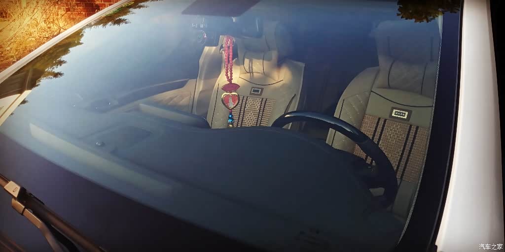 从外往内拍的。座椅加了套套。浅色座椅容易脏。