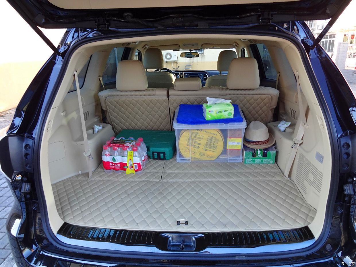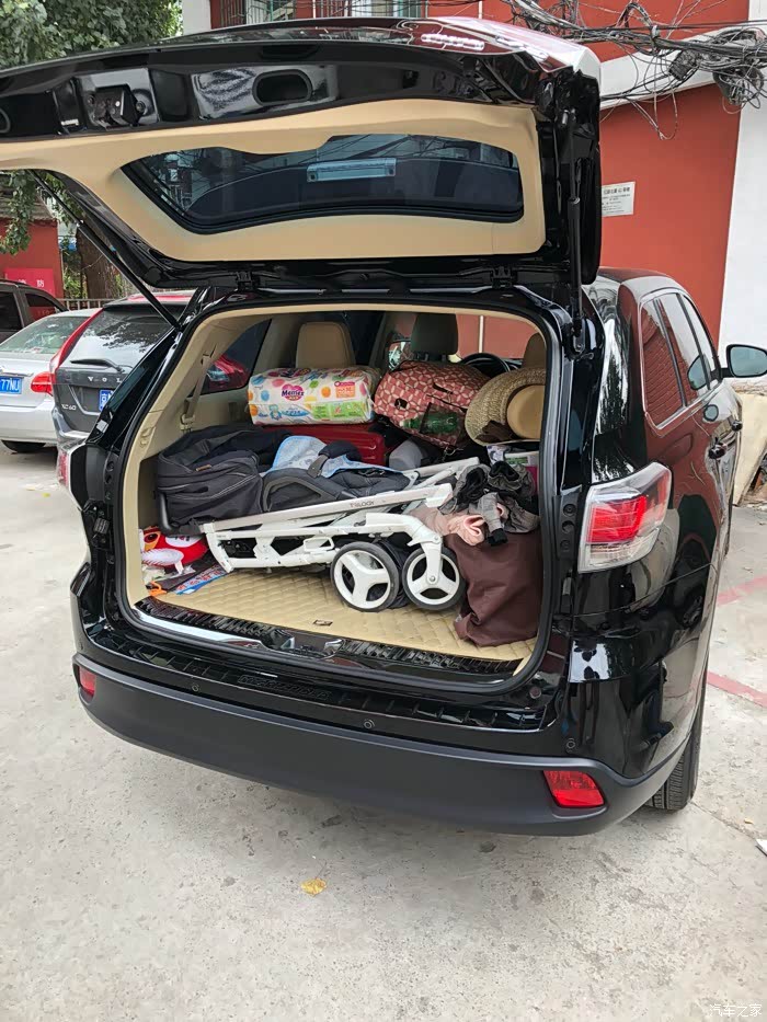 巨大的后备箱空间,后面两个座椅很少用到,放倒后纵深优势明显,放工具箱塑料箱继续放婴儿车毫无压力。