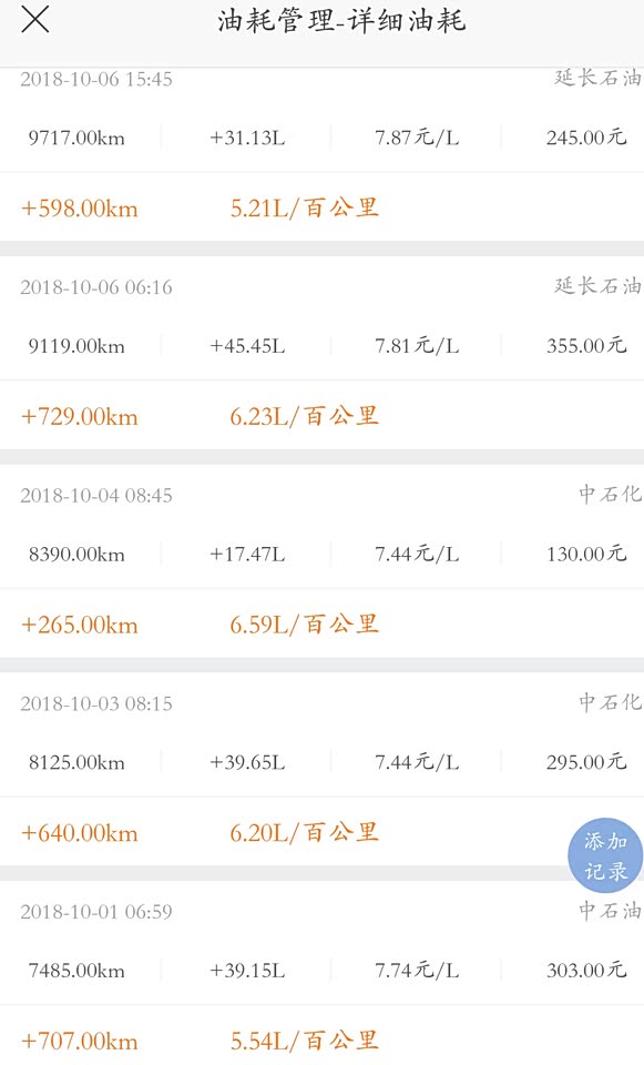 下图是自己记录的油耗,跑高速。从吕梁到秦岭729公里,油耗6.23,秦岭到成都598公里,油耗5.21,跑高速真省油,平常在成都上班,路匀速25,油耗在7.5左右