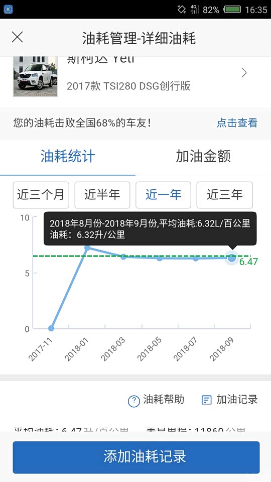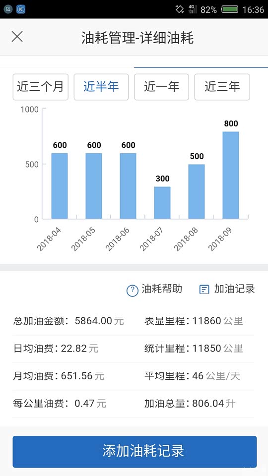 主要用于通勤,上下班每天70公里吧,每个月跑1200公里,正好一直用之家的油耗记录,折下来每公里4毛7的样子,每个月加两次油(一直92的,油桶太贵加不起95),每次300块。