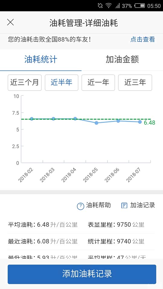 由于路况都一样一半城区一半郊区,所以油耗比较稳定,表二6.4左右吧