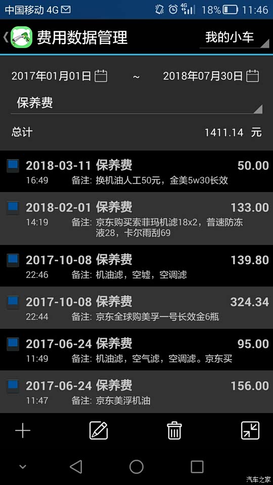现在车子开着很好,就只要换机油和加汽油。我喜欢用美孚一号的全合成,1.2-1.5万公里一换,一年2次左右,每次保养费用机油182元、三滤100元,人工50元,总共费用332元。