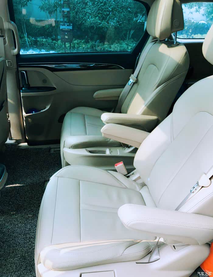 空间宽敞,特别二排座椅非常舒服。座椅是独立的,有扶手,有腿部支撑,坐着躺着随你意。座椅旁边还有隐藏式的杯架,非常实用便捷