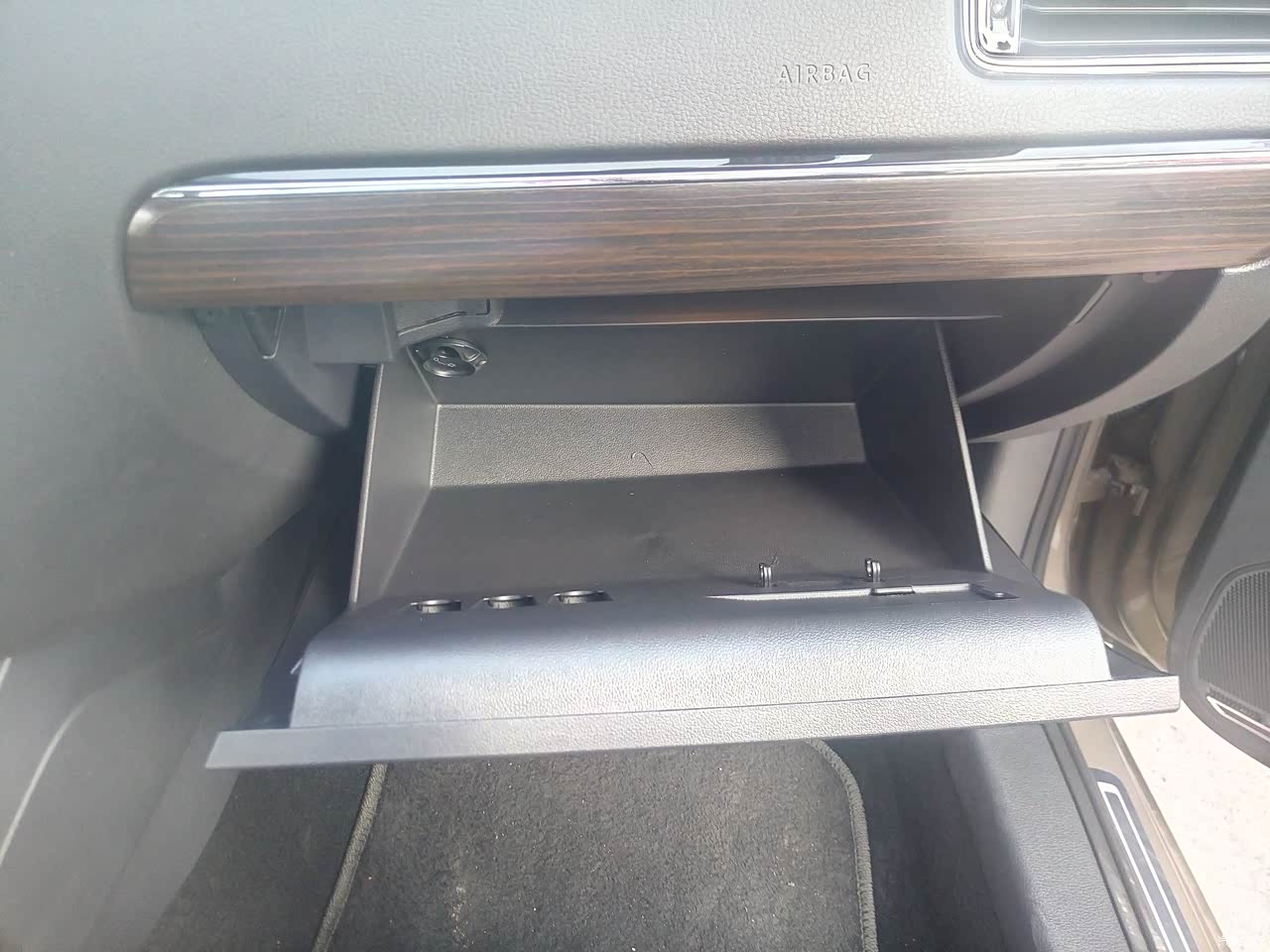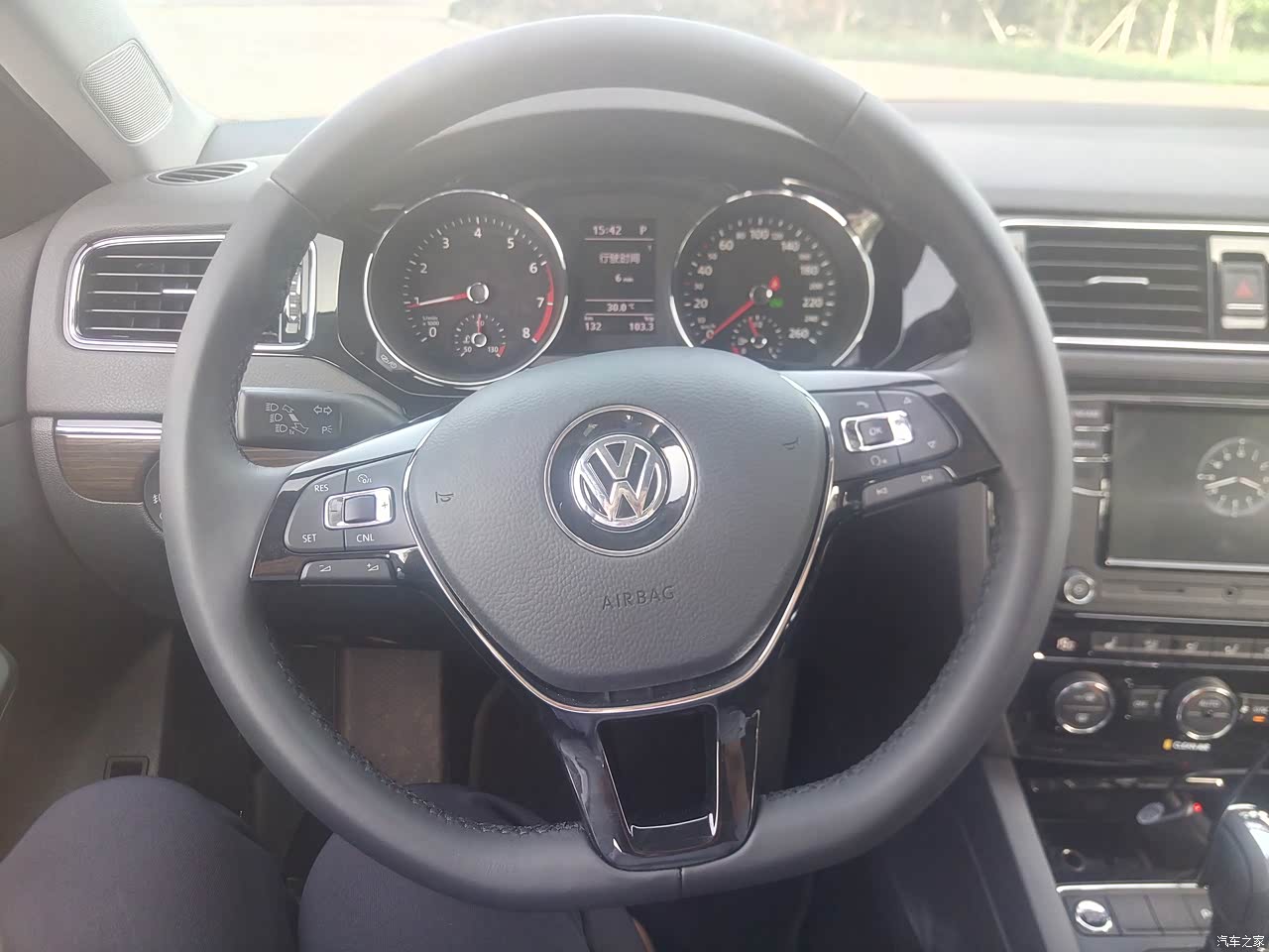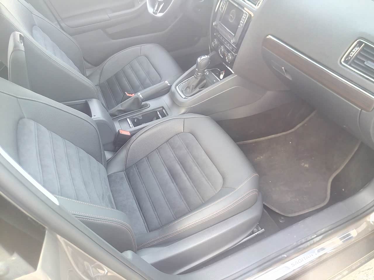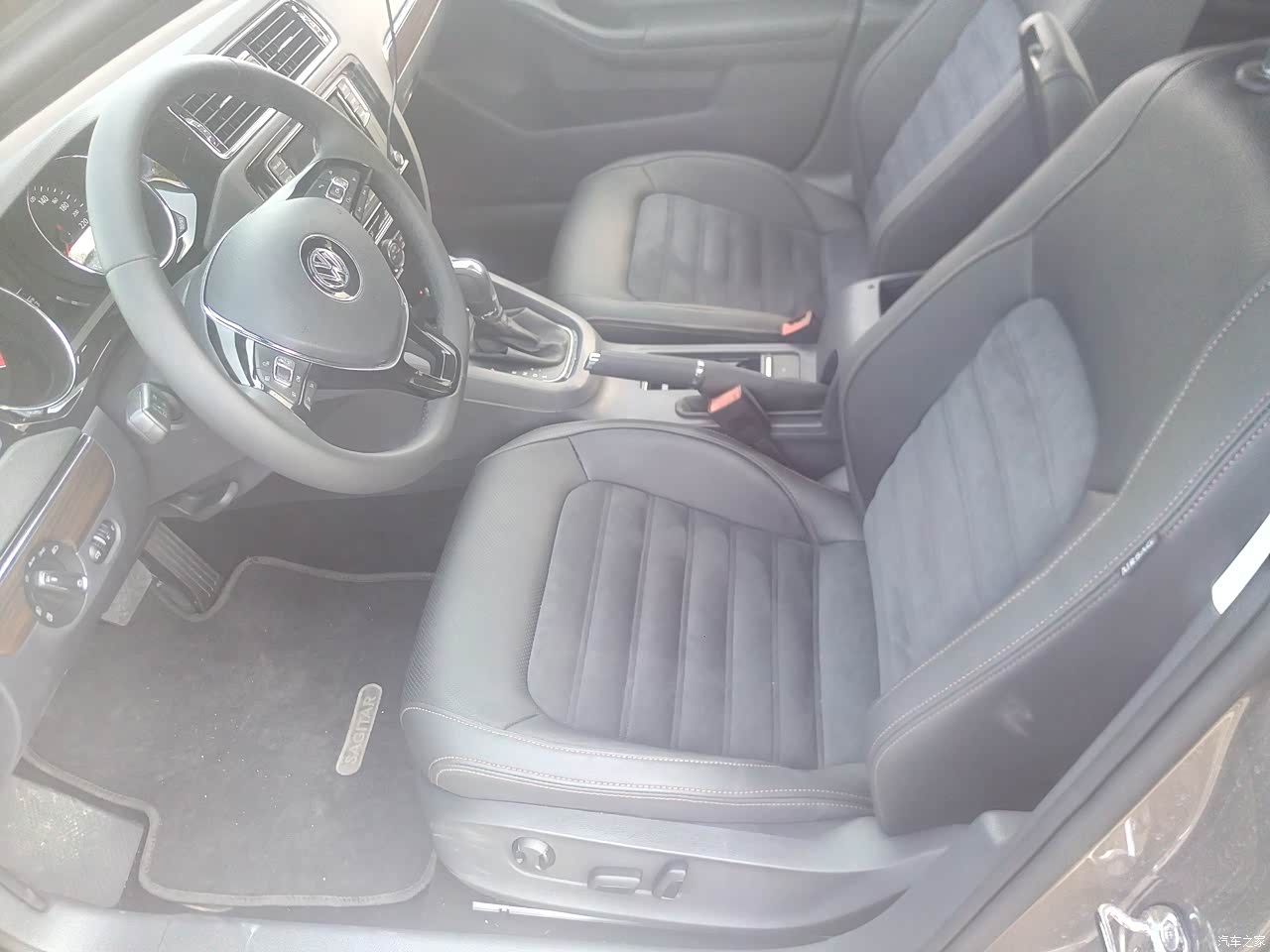 座椅的内饰是真皮加翻毛合二为一的,看起来超级上档次,非常喜欢这种类型,大气不失档次,中控台没什么出彩的地方,大众车的中控台都是一模一样的,平淡无奇,但是操作起来很方便,四个门的杂物箱也是植绒包裹,很不错。车内大部分内饰都是软包整体还不错。
