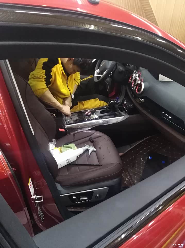正在给内饰贴膜,钢琴漆装饰条很脆弱。