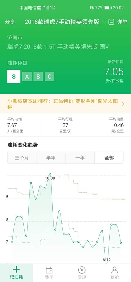 目前跑了2300多公里了,我想应该有权力发表一下自己车的油耗数据了。首先12月底购买的新车,车重1390公斤,又是冬天,又是磨合期,又正赶上过年期间非常拥堵,粗计百公里综合平均油耗大约在7-9个左右(7-9L/百公里),在市区内跑得多,也经常跑跑高架路。在这段时间内,百公里平均油耗最多到过大约11个多一点,最低到过7个左右。至于官方标出的百公里6个多油,经常在市区跑估计是很难达到了,至少我的车目前为止还极少跑进7个以下。短时间跑了几次高速的平均油耗也是在7-8之间,没跑过更低的。
