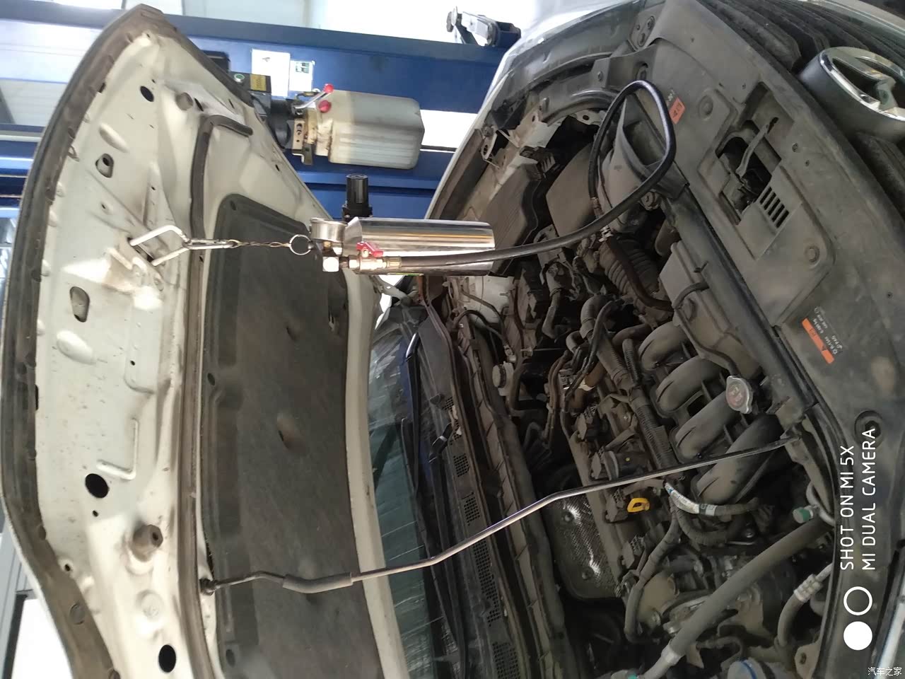 打开发动机盖,在打吊瓶。这个吊瓶的压力表坏了,然后压力显示一直是零,导致我我还以为没加添加剂