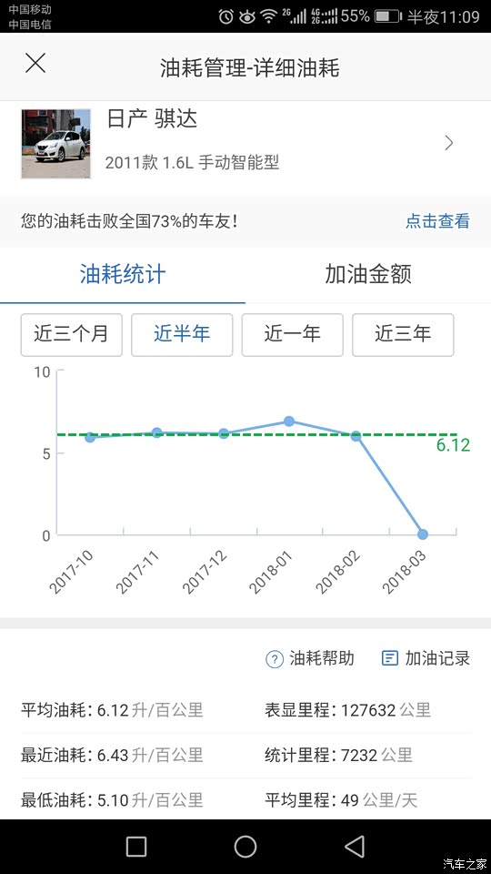 至今行驶12.8万公里,城市、高速路段综合油耗6.1L/100km左右。新车加油后人工记录数据测算,如今在汽车之家“油耗记录”录入数据测算,六年半如一日,持之以恒的省油!