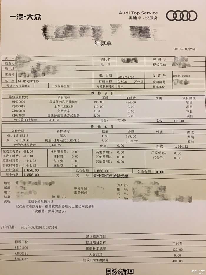4S让我5000去首次保养,但是汽车之家给的厂家建议保养里程是10000公里去首保,所以才开到了9000公里去首保。 很多人都说首保那么晚去,会不会对车不好。厂家既然敢说10000公里,肯定有他的道理,4s让5000公里首保,也是有一些为了挣钱的心思。 原打算用奥迪专供的黑桶机油,但是黑桶机油是5000公里一保养,这车需要5.5升,就是6升(一个4升大桶,2个一升)费用是611元,但是说明书说建议添加嘉实多极护,问了一下,极护一升220元,可以10000公里一保养,其实细算下来,10000公里用极护保养一次的价格,比5000公里用黑桶保养两次的价格低,还能用好油,为什么不选极护呢。