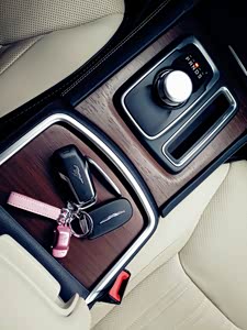 大面积的真皮加实木搭配一个会发光的石英钟,方向盘内皮米色,外皮黑色,中间加一圈银色的镀铬装饰很有感觉