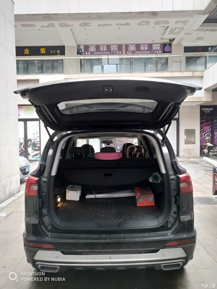 X5的空间很大,毕竟2720的轴距,后排安装一个安全座椅和一个安全提篮,我老婆都可以坐在中间。后备箱的空间也很大,儿童手推车放进去还能放不少的东西!