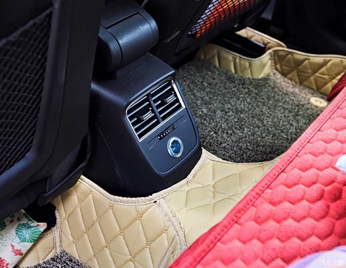 主副驾驶位放东西的地方确实比较少,还好我买的脚垫和坐垫都自带一个储物格,方便放放手机和烟什么的。至于水,只能放门板了,杯座那里不实用,放瓶矿泉水就挡住空调了,尴尬。