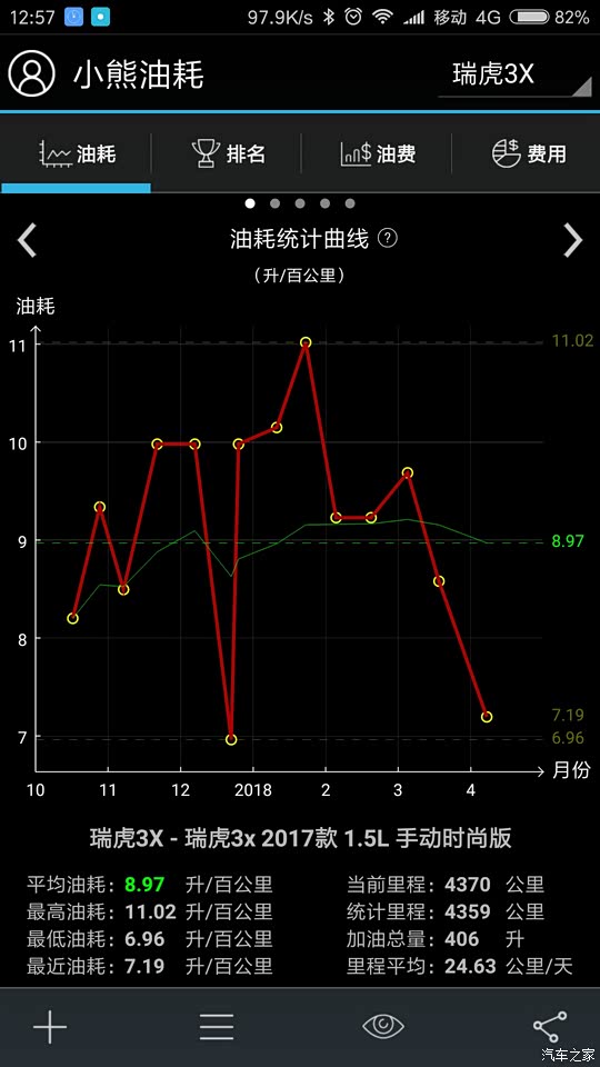 我的老车QQ油耗综合七个油,这个3x综合油耗近九个。不过也没办法,我每天都是短途,每天固定四趟接送孩子,七公里的路有七个红绿灯,经常等红灯就是一两分钟,速度也跑不起来,都是30码左右,车刚热就到目的地了,这个油耗虽然不满意,但是也能接受。有图有真相,我的小熊油耗记录截图