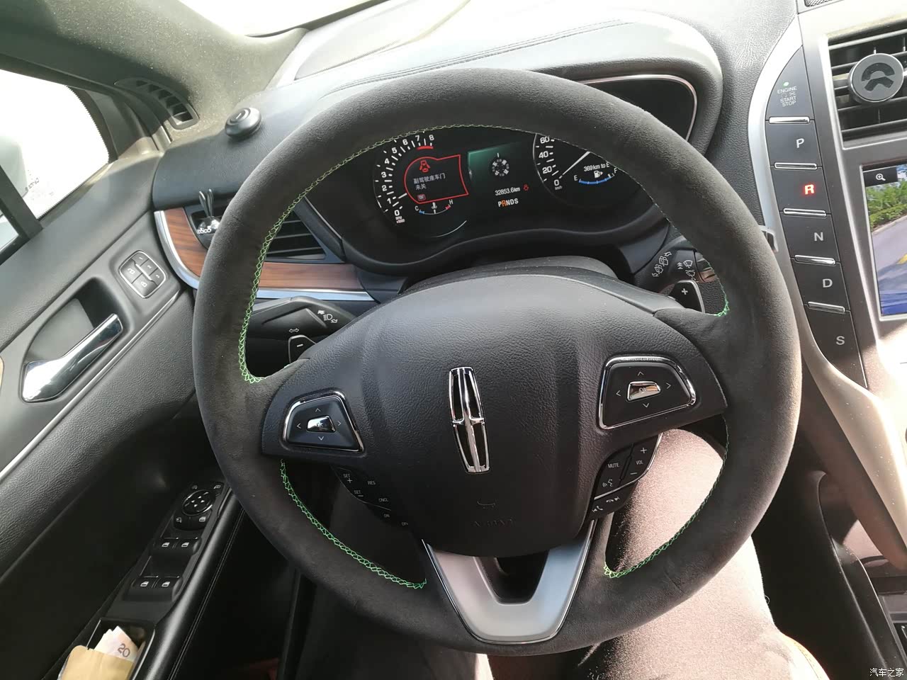 内饰方面移出了档杆的中控位置其实有点空挡,且置物空间太少了,杯架要是放了水,手机都不知道放哪里。 中控的设计很喜欢,关闭的时候全暗,只有如图亮着,功能键齐全又不复杂,不像其他车上杂乱无章的按键。。 鸡翅木的木纹装饰还是很显档次的,车内可能是有点小,但还是能感受来自美国的豪华品牌的诚意。 alcantara方向盘套自己加的,果绿缝线,骚起来??