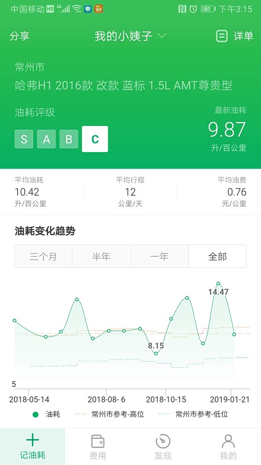 最近媳妇升职加薪了,所以跑的比较勤快了,也不在市区上班了,所以油耗有所下降了,从之前的综合油耗9.7下降到了8.3,但是对于这个小车来说,我依旧觉得油耗好想有点高了,但是没办法,谁让是AMT的变速箱呢,升降档逻辑都是固定死了的!ε=(´ο`*)))唉