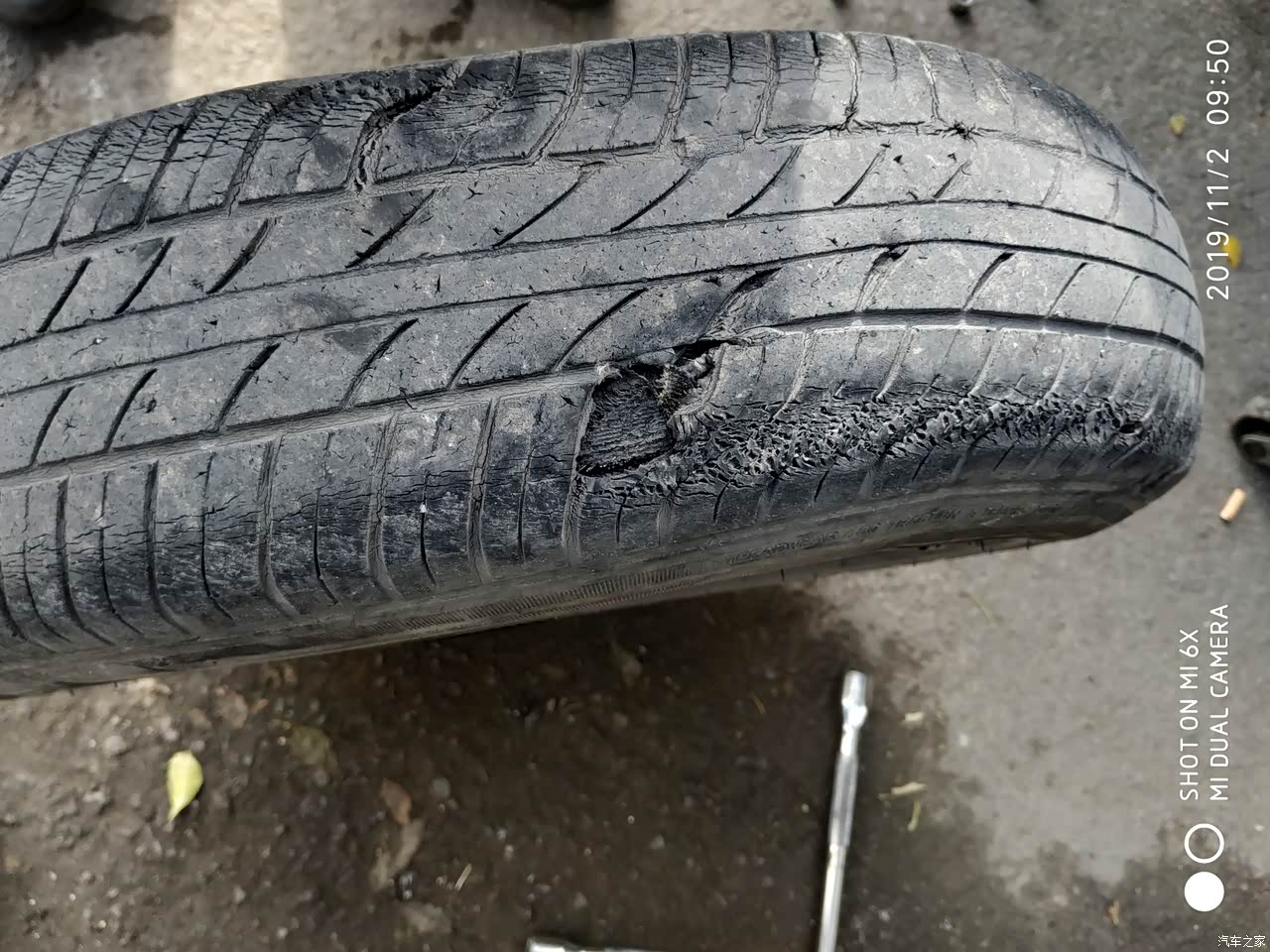 原车带的 最后一个轮胎也废了,在用几天就快爆了,前段时间换了四条了,这个是备胎也不能用了,本来质量就不好,在加上烂路走的多了,提前到寿命了,也就用了4到5要公里吧。