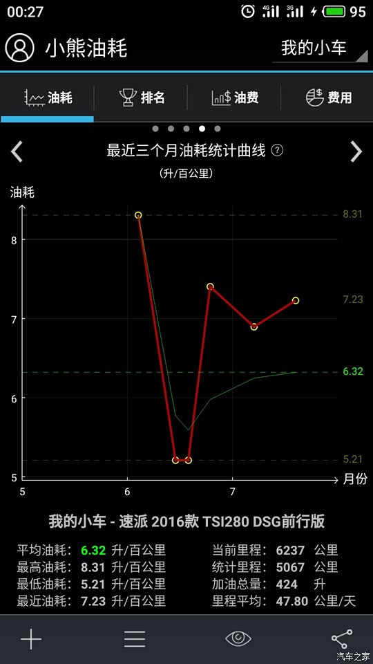 第一箱油在昆明加的70升,英贸旁边那个民营加油站搞特价,95号油一共花了460块钱。 从昆明开回南宁,油表显示用了刚好一半油,跑了780km。剩下半箱油在市内跑了400km就基本在红格的最低。 第二箱油加了67升加满,目前表显还剩1/4多点,跑了600km。看行车电脑总里程油耗7.6L/100km,最近次加油后油耗8.2L/100km。还没过磨合期,这个油耗可以接受。