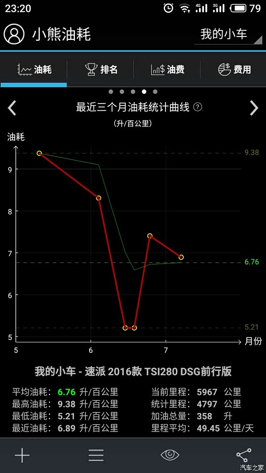 6月中旬回了趟湖南,全程高速,平均时速100,开空调,2成人,油耗5.2L/100km。买车至今小熊油耗计算得出6.76L/100km,表显少0.2-0.3这样。 初步总结这车省油的方法: 1.小脚油门 2.不开空调 3.尽量走不堵的路,哪怕饶远路。 排量小开空调动力损失明显,当然转速起来了也影响不大。反正空调一开室内开车油耗立马上升2-5个油,很厉害!