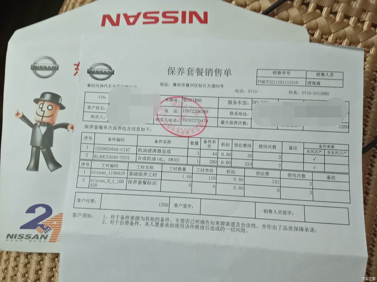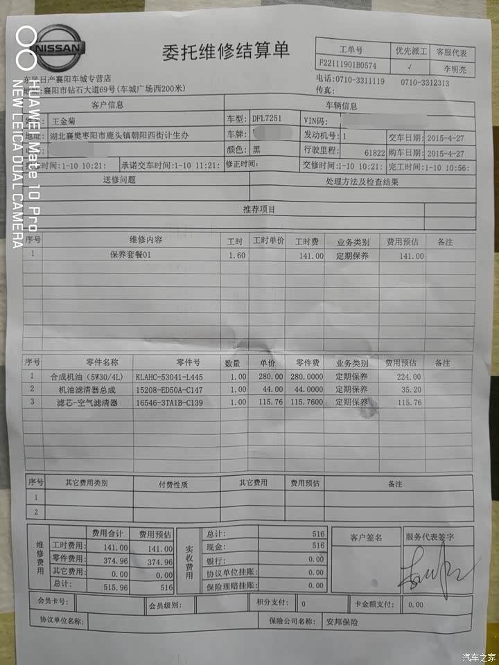 行使61822公里时到襄阳4S店做了保养,仍然是半合成机油,加了4.5升,还是用的保养套餐。这次换了空气滤芯,另付了116元。
