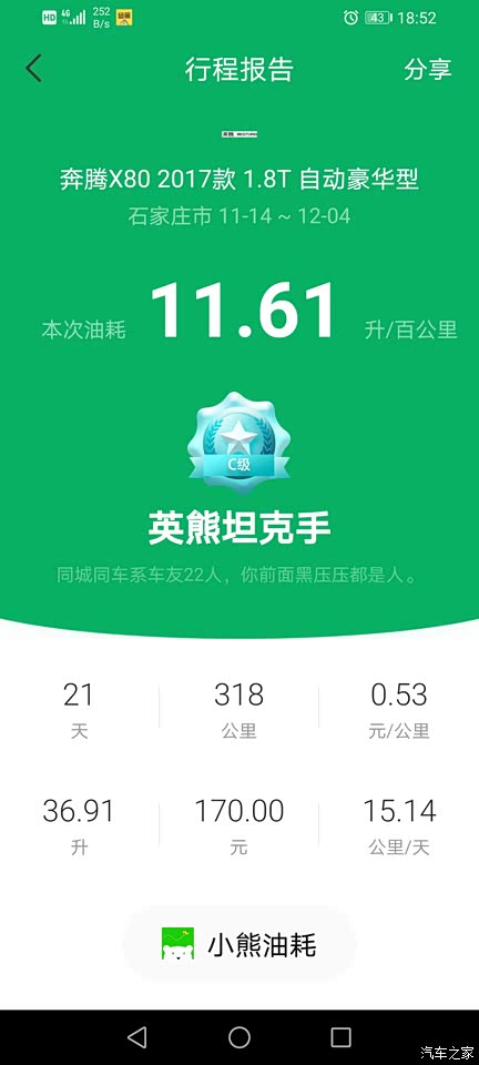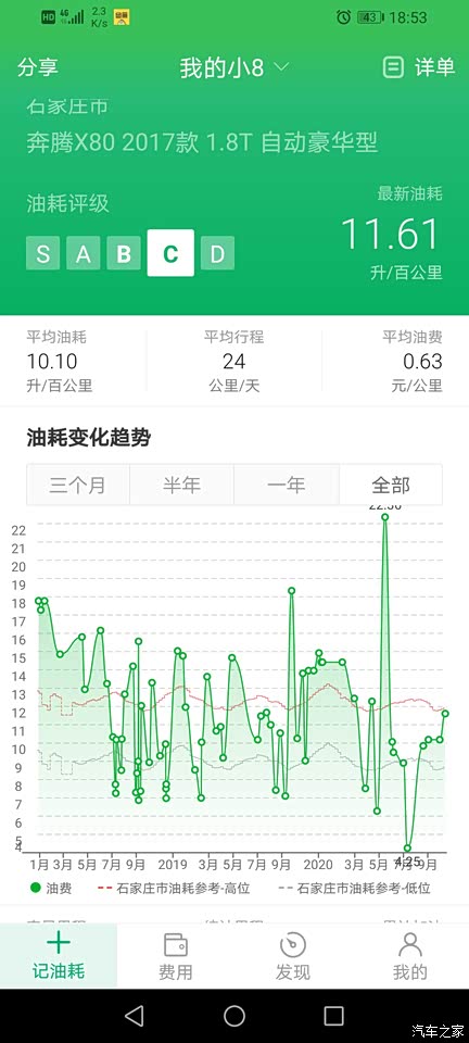 一直用小熊油耗记录油耗和费用,自己掌握以下大概情况