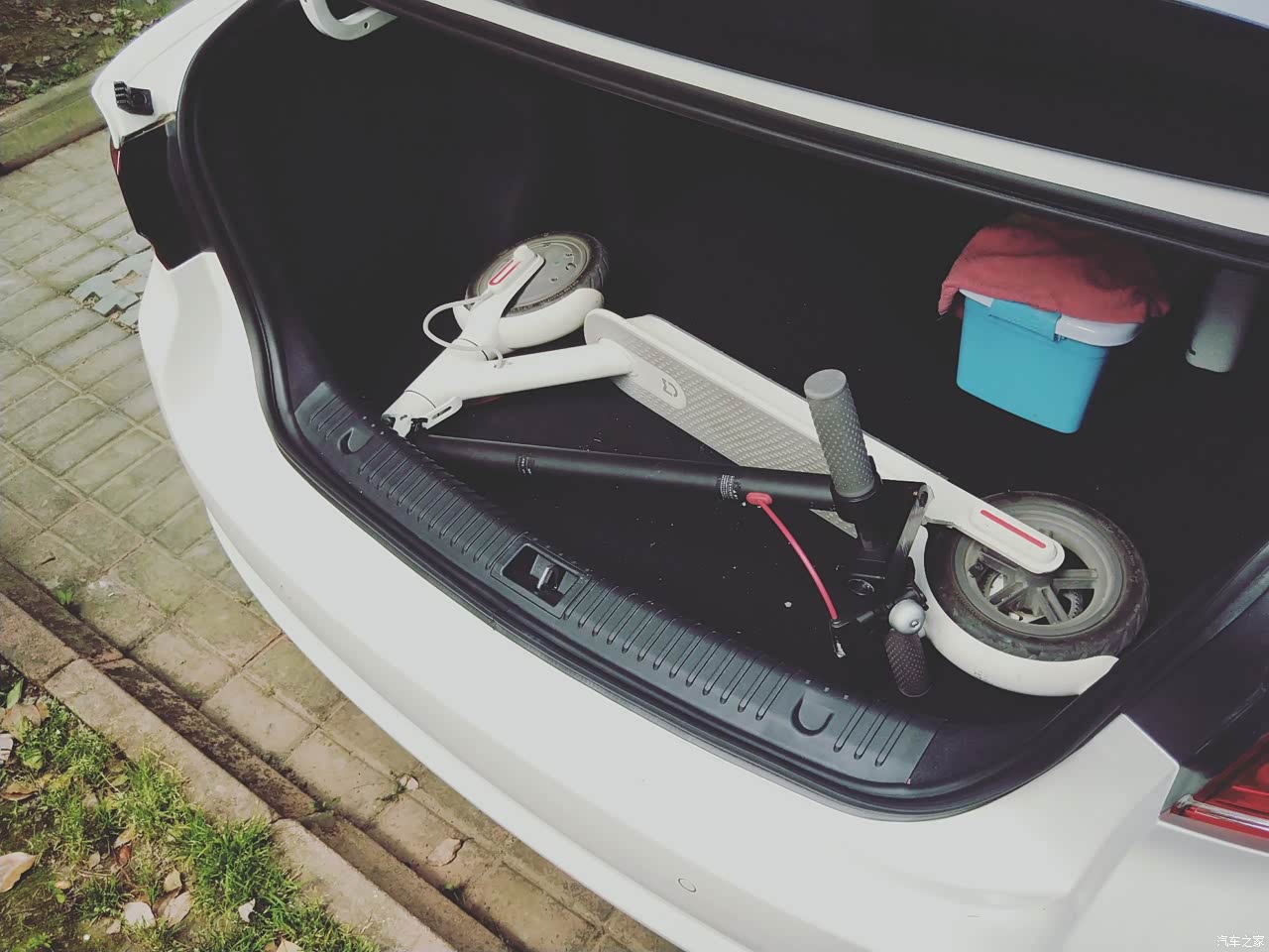 后备箱空间不是很大,放完我的滑板车后,里面只能放个小号收纳箱。