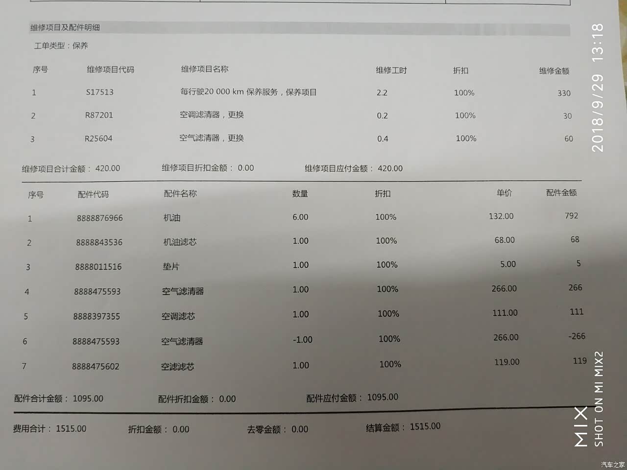 由于要出行,就提前在17000公里时做了2保,在2保中自己增加更换了原本可以不换的空调和空气滤芯,费用1515元