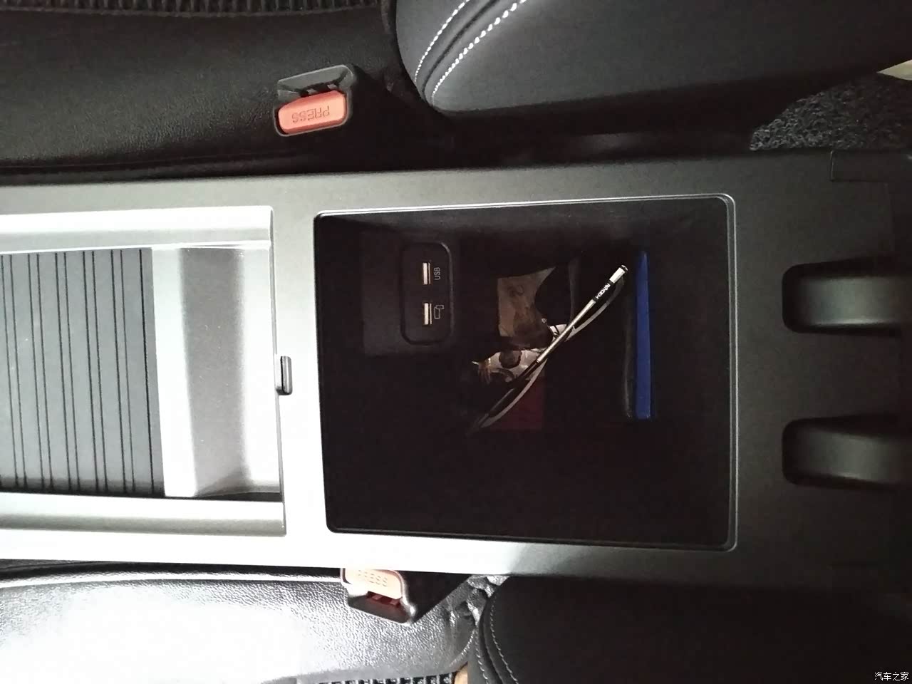 这个空间就比较大啦,其实抬头上面有个放眼镜的专用储物盒,这里还有两个充电插口用着方便。