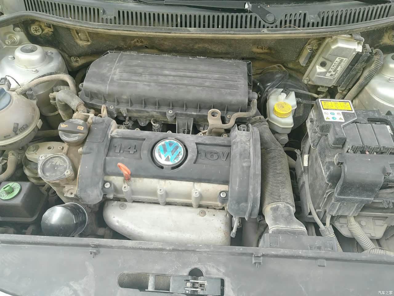 发动机舱,虽然有点脏但是很整齐,这是ea111发动机缸体还是铸铁的,现在改成ea211全铝了