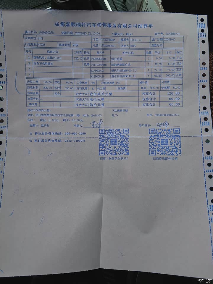 至今做了两次保养,都是厂家免费做!首保做了厂家规定更换机油机滤等,另外做了发动机清洗保养!二保做了三滤更换(空调格~空气格~气油滤),机油我加钱从半合成机油更换成全合成美孚一号,这样保养间隔里程为10000km.同样也做了发动机清洗,洗了应该要好些吧!