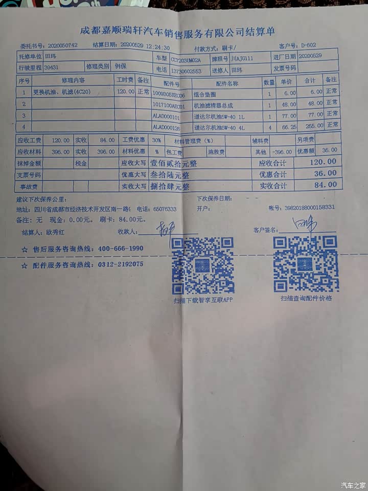 我一直是在4s店进行保养的,已经行驶了71000多公里,从总体感受来说很不错。3年多来没有出现问题,汽车没有出现机械故障,车载多媒体出现了2次重启,问题都不是很大。这次保养只是做了更换机油和机滤,4s店让更换防冻液和刹车油,这两个一直没有换过,问了一些人有的说该换有的说不需要换,我计划下次再去的时候换刹车油,防冻液还是不换。