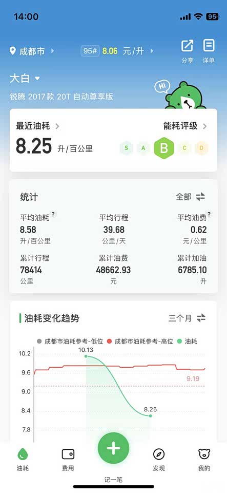 累计行驶了78414公里(来自“小熊油耗”APP统计,每次加油都会记录)平均油耗8.58升/百公里,主要是城市道路行使的多一直都在壳牌加油,长期加95号汽油,自我感觉比92汽油更有力。如果遇到壳牌有活动,也加过3次98的汽油,感觉不出来和95的区别,就当作心理作用吧,清洗了积碳(加油站工作人员这么跟我说的,真假不知)